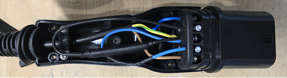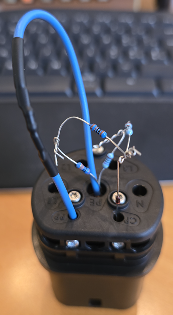 Da ich die notwendigen genauen Widerstände nicht einzeln hatte, musste ich jeweils zwei in Serie zusammen- ... ähm drehen, um auf den notwendigen Widerstandswert zu kommen. Die blaue Drahtschleife ist die Definierung der maximalen Stromtauglichkeit des Kabels. Diese war bei der Lieferung des Steckers mit dabei. Der Widerstandswert ist 680 Ohm, was einer Belastbarkeit des Kabels von 20A entspricht. Natürlich muss dann der verwendete Stecker diese Stromstärke ebenfalls aushalten ! Oder ihr wisst ganz genau, dass an diesen Stecker, wie der Name schon sagt, nur das E-Bike-Ladegerät angeschlossen wird, welches niemals so einen grossen Strom zieht. Alternativ müsste im Stecker eine entsprechende Sicherung eingebaut werden ... ;-)