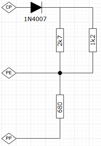 Ja, ich weiss, das Schema ist nicht ganz korrekt so, wenn man die genauen Spezifikationen gemäss DIN EN 61851-1:2012 bzw. J1772 anschaut. Aber Hey, es funktioniert auch so :-) Wer es genauer haben will und die verschiedenen Status auch einzeln durchtesten will, dem sei die Webseite von EVSim empfohlen. Aber ACHTUNG, der Betreiber Mathias Dalheimer reagiert etwas gereizt, wenn man fragt, ob die von ihm erstellte Platine in die Schweiz verschickt werden kann.