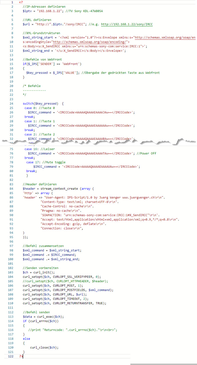 Die Storen steuern und das Licht einstellen, soweit überhaupt kein Problem. Aber den Sony TV steuern ?? Eine ausgiebige Recherche im Internet ergab recht schnell die dazu notwendigen IRCC-Steuercodes für meinen Sony KDL-47W805A. Das sind die Befehle, welche an den TV gesendet werden müssen um quasi die Tasten der Fernbedienung zu simulieren. Nach dem Zusammenbasteln eines kleinen Scriptes funktioniert das auch mehr oder weniger auf Anhieb: