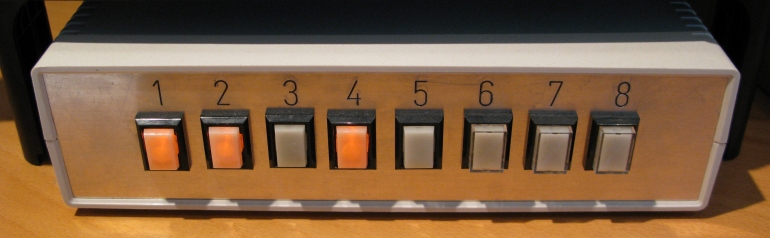 In der heutigen Zeit ist dies definitiv nicht mehr "state-of-the-art". Zum Einen weil ein dauerndes Ein/Aussstecken mühsam ist und zum Anderen weil bekannterweise der Standby-Betrieb auch Strom verbraucht. Eine moderne Lösung muss also her ! In meiner Zeit als Elektriker-Lehrling (1996-2000) baute ich daher die Version 1 des Schaltpultes. Es hat 8 Taster welche einen Schrittschalter ansteuern, welcher wiederum die Ausgänge steuert. Relativ einfach aber dennoch praktisch. Das Lämpchen im Taster leuchtet wenn der Ausgang eingeschaltet ist.