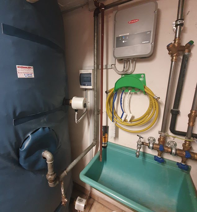 In der Waschküche befindet sich auch der Speicher unserer Heizung. Dieser beinhaltet 2000l Wasser. Im oberen Drittel ist zudem der 175l (kleine) Boiler eingebaut. Der Speicher ist insgesamt deshalb so gross, weil er als Speicher für die Holzheizung dient. Da dabei schnell hohe Temperaturen entstehen und man die Temperatur bei einer Holzheizung nur begrenzt regeln kann muss die Wärme irgendwie abgeführt werden. Die Holzheizung haben wir aus Redundanzgründen belassen, auch wenn die Wärmepumpe keinen solch grossen Speicher benötigt. Die bestehenden elektrischen Heizkörper von 6kW wurden vom Heizungsmensch durch Heizkörper von je 7.5kW ersetzt. Um zwischen den beiden Heizkörpern umzuschalten habe ich eine kleine Umschaltbox mit entsprechender Steuerung zusammengestellt. Der Ohmpilot schaltet die Heizstäbe um, sobald der Boiler seine Temperatur erreicht hat. So wird mit der Überschussenergie der gesamte Speicher geladen.