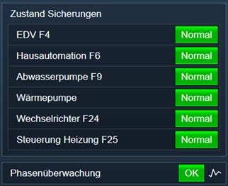 Und so sieht diese Sicherungsüberwachung dann in der Hausautomation aus. Ach ja, das Drehfeld und damit das Vorhandensein der drei Phasen (Phasenüberwachung) überwache ich natürlich ebenfalls gleich mit :-) --> Heute heisst das übrigens nicht mehr Phase sondern Polleiter. Aber Polleiterüberwachung war mir dann doch zu lange ...