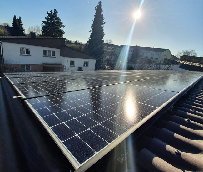 Und so sieht die Anlage auf dem Dach mit 40 Solarmodulen des deutsch/südkoreanischen Typs "Hanwha Q.Peak Duo-G7" mit 330 Wp Leistung pro Modul bei einer Gesamt-Solarfläche von 68m² und 13.2 kWp Maximalleistung dann aus: