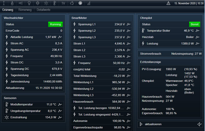 A propos Visualisierung. Wie bereits auf der Seite der Hausautomation geschrieben, ist die Einbindung der Fronius-Geräte dank der sehr gut dokumentierten API überhaupt kein Problem. So lassen sich alle notwendigen Daten im JSON-Format abholen und entsprechend weiterverarbeiten.