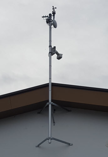 - Kombi-Sensor WGWR 1M, welcher 6.5m über Boden (und 2m über dem Dach) die Windrichtung als auch die Geschwindigkeit erfasst. Als Zusatzsensoren sind daran sowohl der Globalstrahlungs- (Sonneneinstrahlung), der UV- als auch der Wolkensensor angeschlossen