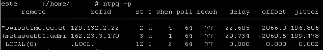 Nach dieser Konfiguration sollte einmalig die Zeit manuell synchronisiert werden. Dies geschieht mit mittels des Befehls ntpdate -u swisstime.ethz.ch. Danach kann der Server mittels /etc/init.d/ntp start gestartet werden. Nach wenigen Sekunden sollte beim Befehl ntpq -p folgendes erscheinen: