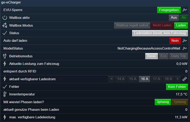 Wie erwähnt, lässt sich die Ladestation sehr gut mit den verfügbaren Protokollen einbinden und steuern. (Die Logik des PV-Überschuss-Ladens habe ich hier noch nicht realisiert. Das geht einfacher, wenn das Auto dann angeschlossen ist und ich sehe, welche Parameter wie gesetzt werden müssen, bzw. ich weiss wie das Auto reagiert. So weiss ich derzeit noch nicht, welches die Mindest-Stromstärke für das Laden ist und ob ein Unterbrechen des laufenden Ladevorgangs bsp. bei Bewölkung sinnvoll ist bzw. ob das Auto damit umgehen kann) |