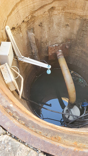 Wie immer, wenn man irgend an einer Ecke etwas anfasst, sieht man auch gleich Potential für weitere Verbesserungen. Zwei Fotos weiter oben sind drei Schachtdeckel zu sehen. Derjenige ganz rechts ist ein Abwasserschacht in welchem das Oberflächenwasser der Garageneinfahrt gesammelt wird. Da dort ebenfalls das Problem mit dem niedrigen Gefälle zur Kanalisation ist, wurde schon vor Jahren (oder seit immer) eine Pumpe mit Schwimmer installiert. Diese schaltet sich ein, sobald das Niveau zu hoch ist und pumpt das Abwasser in die Kanalisation. Was aber, wenn diese Pumpe eines Tages aussteigt ?
