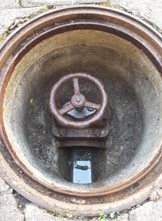 | Sobald der Deckel abgehoben wird sieht man direkt in die Kanalisation. An diesem Handrad konnte der Schieber geöffnet / geschlossen werden. |