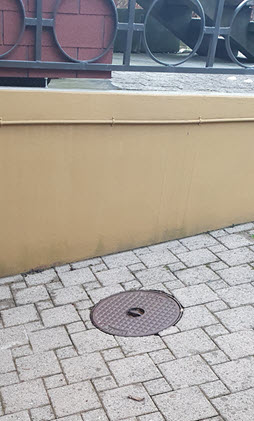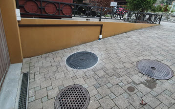 | Nachdem das Loch zugeschüttet, die Verbundsteine wieder eingesetzt und der neue (grössere) Schachtdeckel gesetzt war, sieht man von den Arbeiten kam noch etwas. Da der Rückstauautomat auch Kabel hat (Sonde und Motor) musste die bestehende Elektroleitung durch einen kleinen Kanal ersetzt werden. |