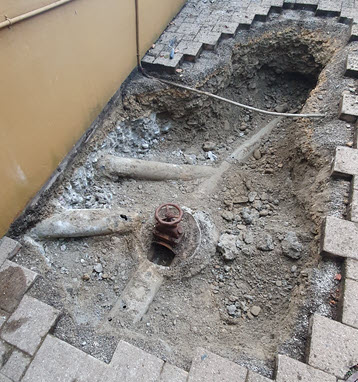 | Während den Abbrucharbeiten des alten Schachtes kamen (wie bei alten Häusern üblich) Überraschungen zu Tage. So war nebst einer Abwasserleitung plötzlich auch die Leitung des Erdgeschosses und des Dachablaufs da. Dies erfoderte etwas Kreativität im Verlegen der Leitungen. |